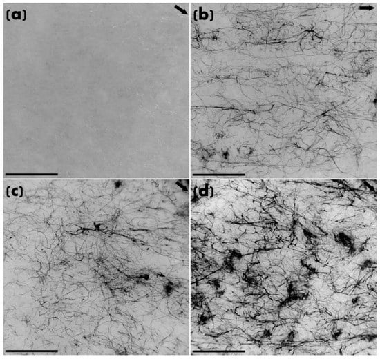 Representative TEM images for: (a) monolithic HDPE; and nanocomposites containing: (b) 2 wt% CNTs; (c) 4 wt% CNTs; and (d) 6 wt% CNTs. Direction of extrusion is represented by the arrow on the top right. Scale bar represents 500 nm.