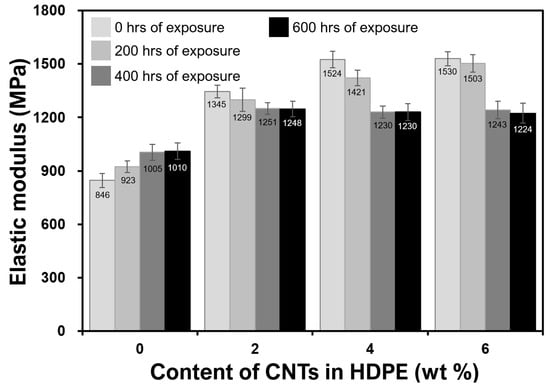 From the analyses of Figure 3 and Figure 4, that there is a very minimal difference in improvements between 4 and 6 wt% compositions can be observed. CNTs are enhancing the elastic moduli and strengths of their respective HDPE nanocomposites. For 6 wt% nanocomposites, it can be noted that because of the presence of agglomerates, the modulus and strength are almost the same as those of 4 wt% nanocomposites. Furthermore, their ability to absorb UV radiations is almost the same or lower for 400–600 h of exposure and presented in Figure 3 and Figure 4. For instance, the tensile strength after 600 h of exposure was found to be 16.75 or 16.71 MPs for 4 wt% and 6 wt% CNT-filled nanocomposites respectively. The cause of such minimal or nearly no improvement in mechanical properties is due to the agglomeration, as evident in Figure 2d and reported in other publications [18,20,27]. Agglomerates (Figure 2d) reduce the surface area of CNTs interacting with the polymeric chains; hence, the mechanical properties were negatively affected (Figure 3 and Figure 4).