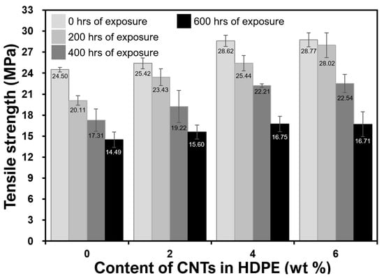 Mechanical properties from tensile testing of the neat HDPE and CNT filled nanocomposites are shown in Figure 3; Figure 4. The data presented are the averages of at least five samples. As compared to neat polymer (0 wt%), the elastic moduli (Figure 3) of all the unweathered nanocomposites improved (e.g., 81% for 6 wt% nanocomposites) because of the presence of CNTs, which stiffen the polymer matrix, as confirmed previously [9,10,23,25,29,30]. Similarly, as compared to neat polymer (0 wt%), the tensile strengths of all the unweathered nanocomposites improved (e.g., 17% for 6 wt% nanocomposites) because of the presence of CNTs. The enhancement in the tensile strength (Figure 4) can be attributed to better stress transfer that resists breakage, giving superior strength to the nanocomposites, as confirmed in number of previous studies as well [9,16,23,25,31].