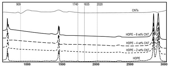 IR spectrum of HDPE, CNTs and nanocomposite films without exposure to UV radiation.