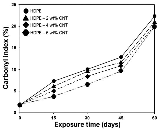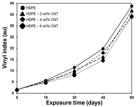 The changes in structural properties of HDPE and CNT-filled HDPE nanocomposites exposed to UV-B radiation were studied (Figure 5, Figure 6 and Figure 7). The complete infrared spectra of HDPE, CNTs and nanocomposites without exposure to UV radiation are shown in Figure 5. After the UV light exposure, the carbonyl (ICO) and vinyl (IV) index were used to evaluate the photooxidation of these polymers and nanocomposites (Figure 6 and Figure 7). The carbonyl and vinyl groups, quantified by their respective absorption indices obtained from the IR spectroscopy (Figure 5), are considered the main photooxidation products for polyethylene [38,39,40]. The spectrum of HDPE presented typical bands of C–H group at 2923 and 2853 cm−1 (Figure 5) that were ascribed to asymmetric and symmetric stretching vibrations, respectively [41,42]. The presence of peaks between 1450–1490 cm−1, in both HDPE and nanocomposites, originate due to CH2 bending [43,44]. For raw CNTs, the peaks between 500–1000 and 1650 cm−1 are due to alkenyl C=C stretching [45,46], as presented in Figure 5. The bands between 2850 and 2922 cm−1 are associated with the symmetrical and asymmetrical stretching of CH2 groups [47].