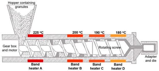 Schematic of extruder with heating temperatures used in this work.