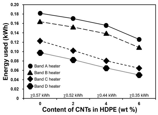 For successful adoption of these novel materials, energy consumed (by manufacturer just before the end-user) is a key business critical variable for bulk manufacturing of sheathing layer in an umbilical cable (Figure 1). Energy consumed by the band heaters (Figure 8) during the extrusion of CNT filled nanocomposites was compared with neat HDPE by calculating the electricity used for 10 min extrusion cycle. Figure 9 shows the energy used by respective band heater, as positioned in Figure 8 with the respective maintained target temperatures. The total energy, the sum (∑) of energy data points for every concentration, is on the horizontal axis line (Figure 9). It can be seen that, in comparison to monolithic HDPE, 4 wt% and 6 wt% nanocomposites used 23% and 39% less energy respectively. This is because of the high thermal conductivity of CNT-filled HDPE nanocomposites widely reported by other research groups [51,52,53,54,55,56]. Owing to the higher thermal conductivities of these nanocomposites, less energy was consumed by the band heater locally to achieve programmed target temperatures (Figure 8). Hence, it can be concluded that lower energy is required to mass-extrude CNT filled thermoplastic nanocomposites, making them energy friendly for offshore sheathing layer in an umbilical cable.
