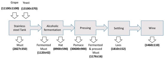 In order to elucidate the origin of metals in the final products as well as to get better control on the winemaking process, a mass balance was established considering the mass of the different elements in each one of the fractions on a wet basis. Therefore, the moisture was determined in the case of solid residues. In addition, according to experimental measurements, 70% of the initial grape mass corresponded to water, 27% to solid residues and 3% was the fraction of decanted mass (lees). These data were quite in agreement with others previously published [20]. Table 4 shows the results found for potassium taken as an example. It was concluded that the total mass of this element considering the different fractions was similar to the sum of the mass of potassium supplied by grapes and yeast. There was only an around 3% deviation between these two magnitudes. It was, hence, possible to conclude that there were neither losses nor contaminations of this element during the winemaking process.