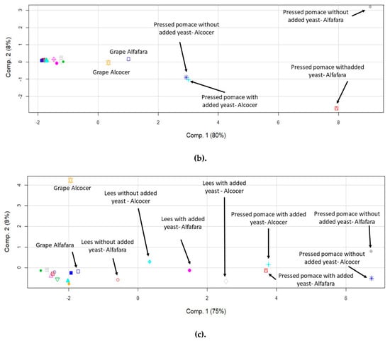 In order to study possible differences in the behavior of the elements in terms of their accumulation in the evaluated winemaking fractions, principal component analysis (PCA) was applied. Initially, the objects were the fractions while the variables were the determined elements. Previous reports have demonstrated the capability of this data treatment for discriminating wine samples according to their provenance [40]. PCA has also proven to be useful in order to trace the origin of the wines by analyzing berries, leaves and wines [41]. Figure 2 shows the score plots obtained for major (a), trace (b) and rare earth elements (c). The points on the graph correspond to the obtained results for the fractions, with and without yeast addition, and the two geographical origins.