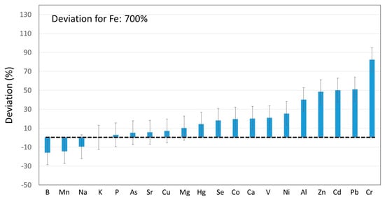 The same consideration was thus extrapolated to other elements. The obtained results are summarized in Figure 3, for a total of 21 elements. First, it should be noted that the precision associated with the so-called deviation, calculated from error propagation, was 20% (see error bars in Figure 2). Therefore, for 14 out of the twenty-one elements tested (i.e., B, Mn, Na, K, P, As, Sr, Cu, Mg, Hg, Se, Co, Ca and V), the mass found in the different fractions corresponded to the mass originally present in the grapes + yeast. Nevertheless, for Ni, Al, Zn, Cd, Pb, Cr and especially for Fe, the deviation was significantly higher than 0. This fact suggested that these elements were incorporated to the products during the grape processing.