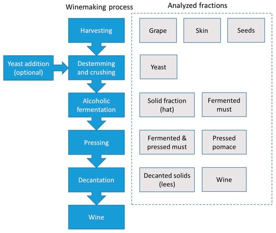 Scheme of the winemaking process (blue boxes) and analyzed fractions (grey boxes).