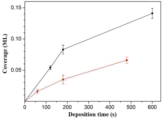 To clearly identify the relationship between the coverage and deposition time, the coverage values and their corresponding error bars obtained from the statistical analysis of the STM images were plotted, as shown in Figure 4. Figure 4 shows two interesting features. First, the adsorption rate of the molecules on the Ge(100) surface gradually decreases upon increasing the deposition time. Using the shapes of the molecular adsorption rate curves, they appear to obey the Langmuir adsorption model within these coverages, in which the adsorption rate depends on the number of vacant sites on the surface because the number of empty sites available for adsorption decreases as the coverage increases [23,24]. Second, the coverage of glycine was higher than that of proline even under the same deposition conditions, which may be caused by the difference in their molecular weight or molecular sticking probability. In particular, it is expected that the amount of sublimed glycine was high when compared to that of proline under the same deposition conditions because the molecular weight of glycine (Mw = 75) is smaller than that of proline (Mw = 115) [25]. From the point of view of the sticking probability, it is expected to be similar because the molecular structures of both molecules are similar, except that the functional group in glycine is a primary amine and proline is a secondary amine.