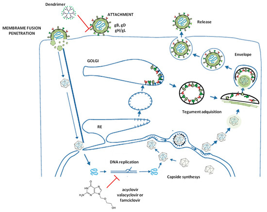 There are several steps in this viral cycle where the antivirals can act (Figure 1). For example, the acyclovir, famciclovir, and valacyclovir drugs inhibit the translation process, while dendrimers act in the first steps of the infection, such as viral entry, by interacting with the HSPG [18].