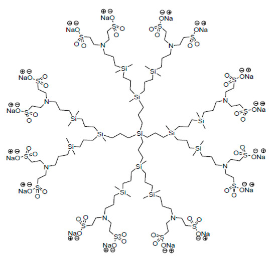 As aforementioned, dendrimers are nano-sized molecules, with a tree-like structure usually generated by the addition of branching units from a central core [2,4,5,6,8,50,81]. The possibility of selecting different cores, as well as the number and type of branching units and the peripheral functional groups, provides dendrimers with a wide array of reactive sites and properties [9]. Even though every year thousands of nanocompounds and dendrimers are published, only the G2-S16 dendrimer will be described in this work [14]. The stable and water-soluble G2-S16 anionic carbosilane dendrimer (Figure 2) was synthesized according to the methods reported by the Dendrimers for Biomedical Applications research group (BioInDen) of the University of Alcala (Madrid, Spain) [21,23,82]. The G2-S16 dendrimer is a second-generation dendrimer presenting 16 sulfonate groups in its periphery. The generation is defined as the number of repeated layers of branching units forming the dendrimer, as mentioned above. The G2-S16 dendrimer presents a silicon core and has a molecular weight of 3,712.78 g mol−1 and its molecular formula is C112H244N8Na16O48S16Si13. The final product was obtained as a white solid from G2Si(NH2)8 (0.50 g, 0.31 mmol) and C2H3SO3Na (5.20 mmol).