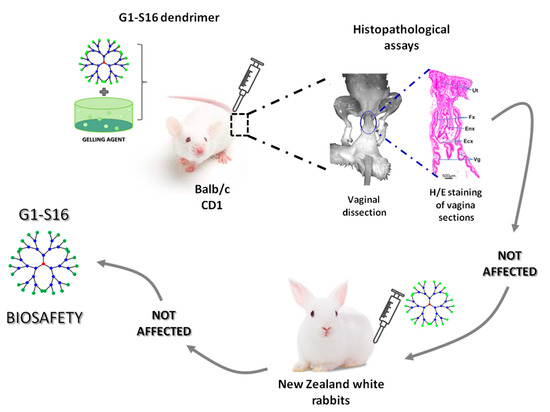 In order to perform further safety studies of the G2-S16 dendrimer, we first chose mice [40,87,93], then female rabbits as the preferred animal model due to the high degree of histopathological similarity between the rabbit and the human vagina. We showed that the G2-S16 dendrimer is well tolerated and does not show any severe adverse events related to vaginal irritation in New Zealand white rabbits at 1 µM and 10 µM doses. No vaginal lesions, irritation or inflammation were detected in this animal model after using repeated doses of the G2-S16 dendrimer [86].