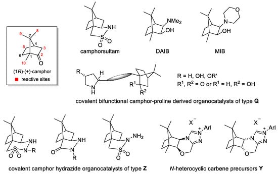 In the field of asymmetric synthesis and catalysis, camphor derivatives have found their application as efficient chiral auxiliaries i.e. camphorsultam [7,8] and as ligands in metal-catalyzed reactions, as exemplified by DAIB [9] and MIB [10] used for the addition of organozinc reagents to aldehydes. In the field of asymmetric organocatalysis [11,12], camphor-derived organocatalysts [13,14] appeared in 2005 [15], shortly after the first seminal works at the turn of the millennium reported by List, Barbas, and Lerner (for enamine catalysis) [16], MacMillan (for iminium catalysis) [17], Jacobsen [18,19] and Takemoto [20] (for noncovalent bifunctional thiourea organocatalysis), and Enders and Kallfass (for N-heterocyclic carbene organocatalysis) [21]. With respect to the structure of camphor-derived organocatalysts, they can be divided into two groups (Figure 1) [13]. The largest group of camphor-derived organocatalysts are mostly covalent bifunctional catalysts characterized by the two chiral fragments, i.e. the camphor framework, which is covalently connected through a suitable spacer (amide, sulfonamide, sulfonate, sulfide, sulfone, or amine linker) to a chiral pyrrolidine i.e. proline derivative or other chiral α-amino acid derivative as generalized by catalyst Q [22,23,24,25,26,27,28,29]. The minor group consists of catalysts with the camphor skeleton as the exclusive chiral framework. The typical representatives thereof are camphor-derived N-heterocyclic carbene precursors Y [30,31,32] and camphor-hydrazide derived organocatalysts Z [33,34,35,36,37,38,39] (Figure 1).