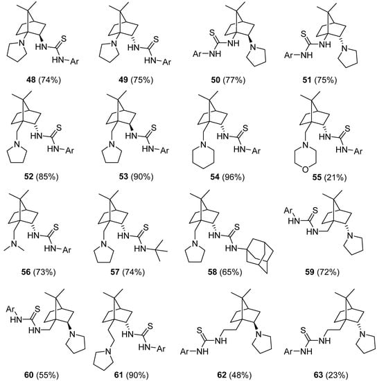 Noncovalent thiourea organocatalysts 48–63 have been prepared in 23–96% yields by treatment of primary amines 10, 11, 16, 17, 22a–d, 23a, 33, 34, 38, 39, 46, and 47 with the corresponding isothiocyanate (1-adamantyl isothiocyanate, tert-butyl isothiocyanate, and 3,5-bis(trifluoromethyl)phenyl isothiocyanate) (Figure 2).
