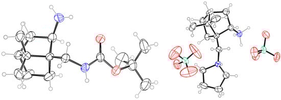 Single-crystal X-ray structures of exo-diamine 29 (left) and endo-diamine·22a·HClO4 (right).