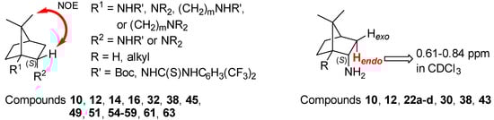 The configuration of the newly formed stereocenter at C-2 for the endo-isomers 10, 12, 14, 16, 32, 38, 45, 49, 51, 54–59, 61, and 63 was also determined by 2D NOESY spectroscopy. NOE between the 2-H and the 8-Me group were in agreement with the (2S)-configuration (Figure 4) [71]. The (2S)-configuration of the endo-isomers 10, 12, 22a–d, 30, 38, and 43 was additionally confirmed on the basis of chemical shift correlations of the highly up-field shifted endo-proton at position 3, which appears in the range of 0.61 ppm to 0.84 ppm (Figure 3). Interestingly, in all successful cases of chromatographic separation of the epimeric mixtures of primary amines, the exo-amine eluted first, followed by elution of the endo-amine.