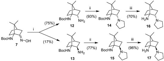 For the preparation of regioisomeric 1,2-diamines with the primary amino function attached at position 1 and the tertiary amine at position 2, Boc-amino-oxime 7 was reduced by applying catalytic hydrogenation in the presence of Raney-Ni, which furnished a chromatographically separable major endo-amine 12 in 75% yield and the minor exo-amine 13 [64] in 17% yield. Cyclization with 1,4-dibromobutane gave the corresponding pyrrolidine derivatives 14 and 15 [64], followed by concomitant Boc-deprotection into respective free diamines 16 [63] and 17 [63] (Scheme 2).
