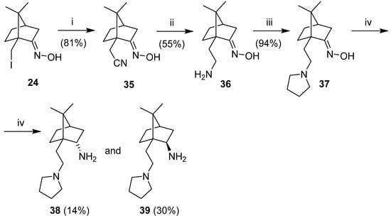 To prepare the desired 1,4-diamines, we followed the idea to introduce an additional methylene group at position 10 in 10-iodocamphor derivatives via cyanation followed by reduction. However, our attempt to prepare 10-cyanocamphor by treatment of 10-iodocamphor (18) with potassium cyanide in DMSO at 75 °C failed and gave only the Groß fragmentation products. On the other hand, treatment of 10-iodocamphor oxime (24) under the same conditions resulted in the desired nucleophilic displacement reaction to yield the corresponding nitrile 35. For the following selective reduction of the cyano group of 35, several reagents were tested i.e. various catalytic hydrogenations and hydride reducing agents. In most cases, mixtures of products were formed, while reduction with LiAlH4 furnished the desired amino oxime 36 as the central intermediate for the preparation of isomeric 1,4-diamines. Following previous examples, epimeric 1,4-diamines 38 and 39 with the primary amino function attached at position 2 were prepared first. Microwave promoted cyclization with 1,4-dibromobutane yielded pyrrolidino-oxime 37, which upon catalytic hydrogenation with Raney-Ni furnished a chromatographically separable major exo-epimer 38 and minor endo-epimer 39 (Scheme 5).