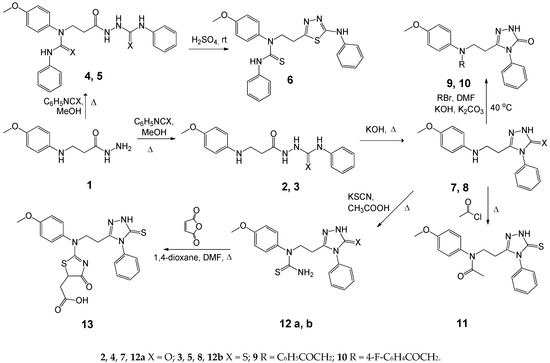 - Tumosienė, I.; Jonuškienė, I.; Kantminienė, K.; Šiugždaitė, J.; Mickevičius, V.; Beresnevičius, Z.J. Synthesis and biological activity of 1,3,4-oxa(thia)diazole, 1,2,4-triazole-5-(thio)one and S-substituted derivatives of 3-((2-carboxyethyl)phenylamino)propanoic acid. Res. Chem. Intermediat. 2016, 42, 4459–4477. [Google Scholar] [CrossRef]