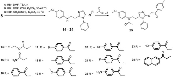 Thione-thiol tautomerism is characteristic of triazolethiones, therefore they easily form S-substituted derivatives, which possess a broad spectrum of biological activities. A series of S-substituted triazolethione derivatives 14–24 were prepared by alkylation reaction of triazolethione 8 with corresponding aliphatic and aromatic halocarbonyl compounds using three methods (A, B, and C) (Scheme 2) [18].