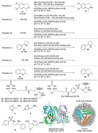 Transfer hydrogenation of imines catalyzed by Sav-based artificial transfer hydrogenases. Adapted from [35,36,37,38].