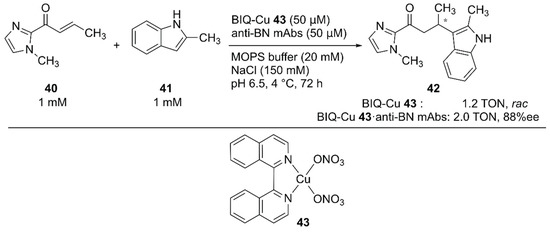 For the Friedel–Crafts reaction, Roelfes and coworkers previously developed LmrR-based ArMs [63,64,65]. Recently, Harada and coworkers employed monoclonal antibodies (mAbs) as protein scaffolds for ArMs catalyzing Friedel–Crafts reactions [66]. They previously developed atroposelective mAbs by immunological optimization of mAbs over binaphthyl (BN) derivatives [67,68]. These anti-BN mAbs could bind 1,1′-bi-isoquinoline (BIQ)-based metal catalysts and provide a chiral environment for the selective reaction. Friedel–Crafts alkylation reactions of 40 and 41 to yield 42 were investigated in the presence of anti-BN mAbs and BIQ-Cu 43 (Figure 8). Upon complexation of BIQ-Cu 43 with mAb R44E1, 88% ee ((+)-42) with 10% yield was obtained. The authors assumed that the obtained enantioselectivity corresponded to 99% ee when the contribution of unbound BIQ-Cu 43 was excluded.