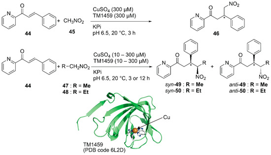 Previously, Roelfes and coworkers reported a DNA-based ArM as a catalyst for the Michael addition reaction [69]. Recently, Fujieda et al. developed a protein-based ArM for this transformation [70]. As described above, their previous work on catalytic dihydroxylation with Os·TM-1459 proved that TM-1459 could be utilized as a ligand for metal ions [48]. This finding prompted them to prepare Cu·TM1459 for the stereoselective Michael addition of nitroalkanes. Based on the crystal structure of Cu·TM-1459(WT), a small library of TM-1459 variants bearing copper-binding sites comprising two or three histidine residues were prepared in silico. The library was tested for the Michael addition of nitromethane 45 to azachalcone 44 (Figure 9).