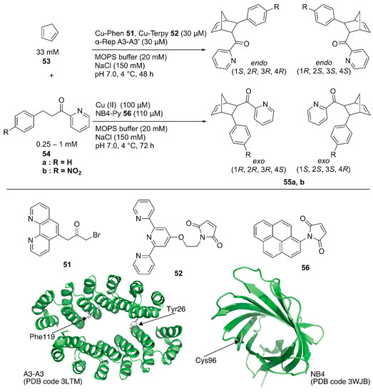 Recently, Ricoux and coworkers employed a bidomain α-selenoid repeat protein (α-Rep A3) as a scaffold for an artificial Diels-Alderase [79]. α-Rep A3 forms a dimer (A3-A3) with a confined cavity. The two domains of α-Rep A3 were genetically linked to form a single chain A3-A3′ and one cysteine residue was introduced into A3-A3′ (Y26C or F119C), enabling 1:1 ligand anchoring in one protein cavity. Polypyridyl copper complexes, Cu-phenanthroline (Phen) 51 or -terpyridine (Terpy) 52, were covalently attached to Y26C or F119C of A3-A3′ (Figure 10). As a benchmark reaction, the Diels–Alder reaction between 2-azachalcone 54a and cyclopentadiene 53 was tested. ArM 51·A3-A3′ generally resulted in a higher conversion than 52·A3-A3′ because of the larger cavity size. In contrast, 52·A3-A3′ exhibited higher enantioselectivity, with up to 52% ee (Table 4, entries 1–4).