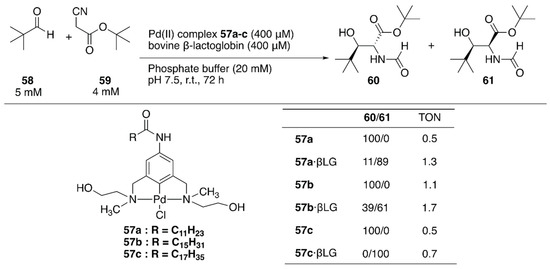 Two decades after the reports of metal-free artificial aldolases based on antibodies [84,85], Thorimbert et al. introduced the prochiral Pd(II)·NCN-pincer complexes 57a–c into bovine β-lactoglobulin (βLG) by utilizing supramolecular recognition between βLG and a fatty acid (Figure 11) [86]. A molecular docking simulation predicted that a hydroxy group installed on a substituent of the nitrogen atom of the NCN ligand would be beneficial for a stable supramolecular assembly because of the H-bond interaction between the OH group and the carboxylate of Asp85 in βLG. In the absence of βLG, an aldol condensation reaction between 58 and 59 catalyzed by 57a–c alone yielded exclusively the trans product 60 (Figure 11). In contrast, 57a–c·βLG preferentially gave cis product 61; this is probably because the stereo-configurations of 57a–c were defined by the βLG matrix, as suggested by the molecular docking simulation.