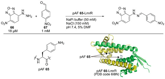 Subsequent to the development of the above ArM containing an unnatural amino acid, Roelfes and coworkers developed a nonmetal artificial enzyme by incorporating a catalytically active unnatural amino acid [92]. They introduced the p-phenylalanine (pAF) 65 residue to LmrR by combining an expanded genetic code method for p-azidophenylalanine incorporation with subsequent chemical reduction. The catalytic activities of the artificial enzyme toward hydrazine formation between 66 and 67 were evaluated (Figure 13). The reaction proceeded with 6% yield in the absence of the catalyst, and 1 mM aniline boosted the reaction to 40% yield. Owing to the recruitment of the substrates in its hydrophobic cavity, even 10 μM LmrR alone was found to accelerate the reaction to give the product in 46% yield. Further improvement was observed with LmrR(V15pAF), which provided the best result (72% yield) among the four pAF 65-containing LmrR variants. A related oxime formation reaction was also tested and LmrR(V15pAF) exhibited satisfactory performance, highlighting its proficient activity as a general nucleophilic catalyst. Mayer, Roelfes, and coworkers applied directed evolution to LmrR(V15pAF) for hydrazine formation [93]. They targeted 13 residues forming the hydrophobic pore of LmrR(V15pAF) and conducted several rounds of evolution to identify beneficial mutations. Combination of the beneficial mutations finally achieved the LmrR_pAF_RMHL variant, in which four additional mutations were incorporated into LmrR(V15pAF), displaying a kcat value 91-times higher than that of its parent. Afterwards, an ArM based on LmrR(V15pAF) was developed, as described later in this review [94].