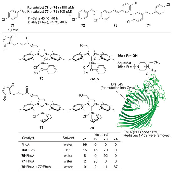 Schwaneberg and coworkers developed a cascade reaction comprising two different ArMs [111]. The GH catalyst 75 catalyzing cross-metathesis and Rh catalyst 77 catalyzing hydrogenation reaction were individually covalently anchored on ferric hydroxamate uptake protein component A (FhuA), to give ArMs 75·FhuA and 77·FhuA (Figure 15). The benchmark reaction produced 74 via cross-metathesis of chlorostyrene 71, yielding stilbene derivative 73, which subsequently underwent hydrogenation to form 74. A homogeneous mixture of the GH catalyst 76a and Rh catalyst 78 in tetrahydrofuran (THF) resulted in 70% yield of 73, suggesting low hydrogenation efficiency. In contrast, the reaction efficiently produced 74 in 87% yield when ArMs 75·FhuA and 77·FhuA were used. This result demonstrated that ArM technology is beneficial when two metal catalysts are combined by compartmentalization within a protein scaffold.