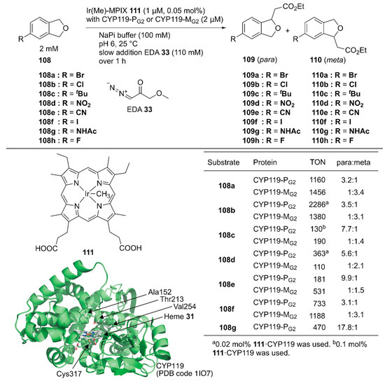 Roelfes et al. utilized an E. coli recombinant lactococcal multidrug resistance regulator (LmrR) as a host protein for various ArMs. LmrR is a homodimeric protein with a size of 13.5 kDa per monomer. A unique flat hydrophobic cavity formed at the interface of the dimer allows the binding of flat aromatic organic molecules and planar metal complexes [11]. As mentioned above, the rapid growth of hemoprotein engineering toward cyclopropanation prompted them to insert heme 31 into LmrR (Figure 7) [59]. The crystal structure of 31·LmrR revealed that heme 31 was located between the two W96 residues and was expected to be shielded from other external molecules such as substrates (Figure 7). The electron density of heme 31 also suggested that there were several binding modes of heme 31 in LmrR. Accordingly, considerable dynamics in the heme-binding may exist, allowing conformational changes in LmrR during the catalytic reaction. This was supported by molecular dynamics (MD) simulations indicating that one of the two W96 residues was rotated toward the outside of the pore to create a space around the heme for substrate access. The cyclopropanation of 35 with 33 was investigated (Figure 7, reaction iii). Although 31·LmrR displayed a TON of 247 with 17% ee, a TON of 51 with no ee was observed for 31 alone (Table 3, entries 5 and 6). This result demonstrates that the LmrR scaffold accelerated the reaction and improved its selectivity. The effect of the hydrophobic pores comprising M8, V15, F93, W96, and D100 was investigated by introducing alanine mutations (Table 3, entries 7–11). The absence of enantioselectivity for 31·LmrR(W96A) was attributed to the loosening of the chiral interaction between 31 and LmrR. The highest activity was obtained with 31·LmrR(M8A) when the reaction was performed at pH 7.0 (Table 3, entry 12).