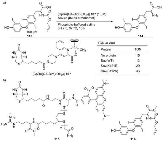 Ward and coworkers have demonstrated asymmetric transfer hydrogenation by using streptavidin (Sav)-based ArMs. Sav is a homotetrameric β-barrel protein with an approximate molecular weight of 65 kDa from Streptomyces avidinii. Owing to the strong supramolecular recognition between Sav and biotin, the desired metal complex can be accommodated in the cavity of Sav by simply mixing the biotinylated metal complex with Sav without further procedures. For genetic optimization purposes, recombinant Sav expressed in Escherichia coli (E. coli.) has been utilized. This facile and versatile strategy enables the screening of a set of Sav variants with various biotinylated d6-pianostool complexes. Previous studies by Ward et al. have been reviewed elsewhere [32].