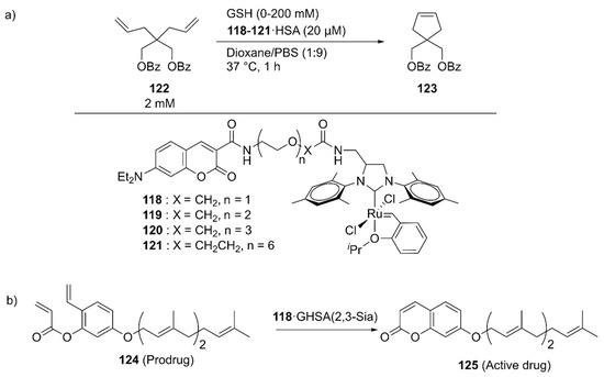 In 2011, the first ArMs catalyzing olefin metathesis, artificial metathases, were reported by Ward and Hilvert, respectively [103,104]. As the abiotic cofactor, a second-generation Grubbs–Hoveyda (GH) catalyst possessing an anchoring moiety was utilized in these studies, as well as in subsequent reports from other research groups [105,106,107,108,109,110].