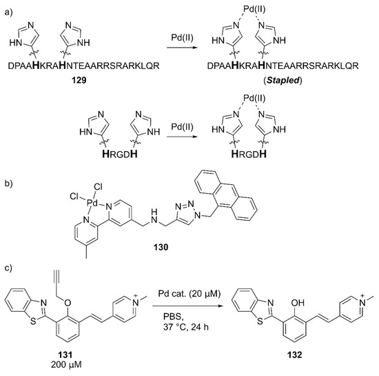 - Learte-Aymamí, S.; Vidal, C.; Gutiérrez-González, A.; Mascareñas, J.L. Intracellular Reactions Promoted by Bis(histidine) Miniproteins Stapled Using Palladium(II) Complexes. Angew. Chem. Int. Ed. 2020, 59, 9149–9154. [Google Scholar] [CrossRef] [PubMed]