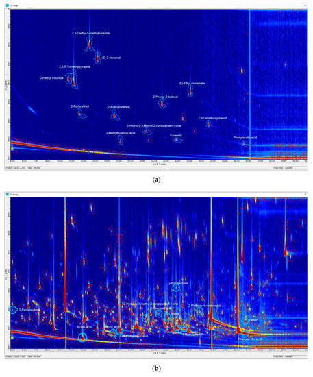 The first identification step of odor-active compounds in CS and CB was performed by comparing the experimental linear retention indices (LRI) and the odor descriptions of the odorants present in different chromatogram regions, recorded during the AEDA, to outcomes obtained in previous works of coffee odorants [13,14], and to data compiled in the Leibniz-LSB@TUM Odorant Database [15]. In case of matching, authentic reference compounds were injected into GC-O/FID to confirm the proposed structures. The second step of identification was the comparison of the GC-O analysis of the concentrated volatile extracts and reference compounds using a second column with different polarity (DB-5). Finally, to confirm the proposed structures, samples were analyzed by GC×GC-TOF. Before injection, volatile extracts of CS and CB were separated into different fractions, as detailed below in Materials and Methods section. Each fraction was then analyzed by GC-O and by comprehensive two-dimensional GC-MS, together with reference compounds, to identify odor-active compounds. As an example, Figure 1 reports the TIC of 2D-GC-MS plots of a mixture of thirteen reference compounds (a) and a sample of acidic volatiles (AV) fraction of coffee silverskin (b).