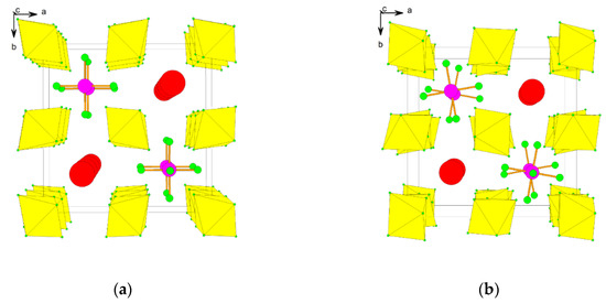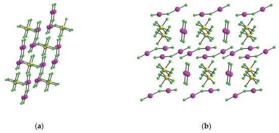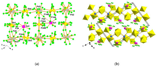 (a) Packing of Rb+ and [XeF5]+ cations and [SbF6]− anions in the crystal structure of high-temperature (296 K) form of β-Rb[XeF5][SbF6]2; (b) Packing of Rb+ and [XeF5]+ cations and [SbF6]− anions in the crystal structure of low-temperature (150 K) modification of α-Rb[XeF5][SbF6]2. Copyright (2017) Wiley. Used with permission from Ref. [32].