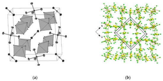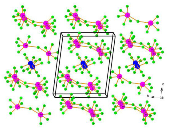 Photochemical synthesis between XeF2, MnF3, and UV-irradiated elemental F2 in aHF yielded [XeF5]2[MnF6] (2XeF6·MnF4), [XeF5][MnF5] (XeF6·MnF4) and [XeF5]4[Mn8F36] (XeF6·2MnF4) [36]. The crystal structure of [XeF5]2[MnF6] consists of [XeF5]+ cations and octahedral [MnF6]2− anions (Figure 6).