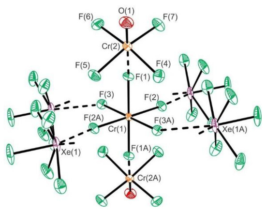 Reactions between molten mixtures of XeF6 and CrVIOF4 proceeds by F2 elimination to form [XeF5][Xe2F11][CrVOF5]·2CrVIOF4, [XeF5]2[CrIVF6]·2CrVIOF4, [Xe2F11]2[CrIVF6], and [XeF5]2[CrV2O2F8] [38]. On the other side, their reactions in aHF and CFCl3/aHF yield [XeF5]2[CrV2O2F8]·2HF and [XeF5]2[CrV2O2F8]·2XeOF4 [38]. Their crystal structures contain [XeF5]+ and/or [Xe2F11]+ cations, which interact with their respective anions by secondary Xe···F interactions. In the case of [XeF5][Xe2F11][CrVOF5]·2CrVIOF4 and [XeF5]2[CrIVF6]·2CrVIOF4, the CrOF4 is introduced into the coordination sphere of [CrVOF5]2− and [CrIVF6]2− anions, respectively, upon crystallizations (Figure 10). The crystal structure of [Xe2F11]2[CrIVF6] is comprised of [Xe2F11]+ cations and [CrIVF6]2− anions.