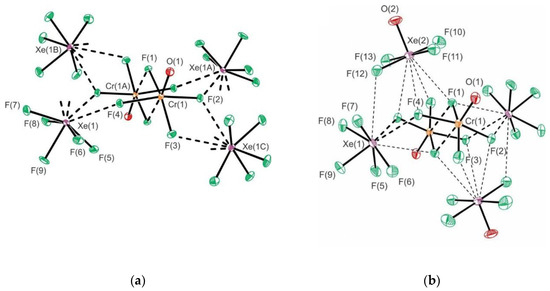 (a) The coordination sphere of the [Cr2O2F8]2− anion in the crystal structure of [XeF5]2[CrV2O2F8]. Secondary Xe···F bonding interactions and Cr···Fb bridge bonds are indicated by dashed lines; (b) The coordination environment around the [CrV2O2F8]2− anion in the crystal structure of [XeF5]2[CrV2O2F8]·2XeOF4. Secondary Xe···F bonding interactions and Cr···Fb bridge bonds are indicated by dashed lines. Copyright (2019) Wiley. Used with permission from Ref. [38].