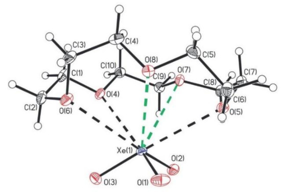 The 15-crown adduct of XeO3, i.e., (CH2CH2O)5XeO3 was synthesized at ambient temperature by reaction of 15-crown-5 with HF-acidified aqueous solution of XeO3 [41]. It was structurally characterized by Raman spectroscopy and single-crystal X-ray diffraction (Figure 15).