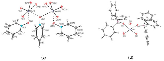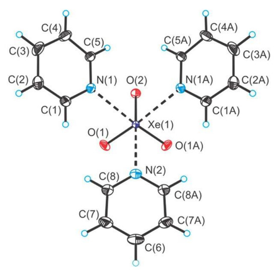 Adducts between XeO3 and N-bases (pyridine and 4-dimethylaminopyridine) were also reported (Figure 17) [43]. Additionally, the crystal structures of the XeO3 adducts with the fluoride and bifluoride salts of their pyridinium cations were determined (Figure 18) [43].