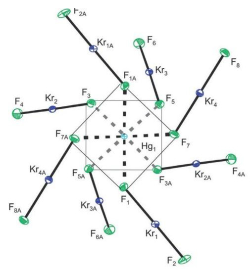Beside xenon, krypton is the only noble gas where isolable compounds in macroscopic amounts can be prepared [44]. Its chemistry is limited to the +2 oxidation state. Known krypton(II) compounds are less stable than corresponding xenon(II) salts. Compounds in which KrF2 serves as a ligand towards Lewis centers have been only recently prepared [45]. The latest example is the synthesis and crystal structure determination of [Hg(KrF2)8][AsF6]2·2HF [45]. It is the first homoleptic KrF2 coordination complex of a metal cation (Figure 19).