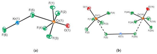 The KrF2·CrOF4 and KrF2·2CrOF4 adducts were synthesized and their crystal structures determined [28]. The crystal structure of the former comprises of F–Kr–F···Cr(O)F4 species in which KrF2 is weakly coordinated to CrOF4 (Figure 20). In the latter both fluorine atoms of KrF2 coordinate to CrOF4 to form F4(O)Cr···F–Kr–F···Cr(O)F4.
