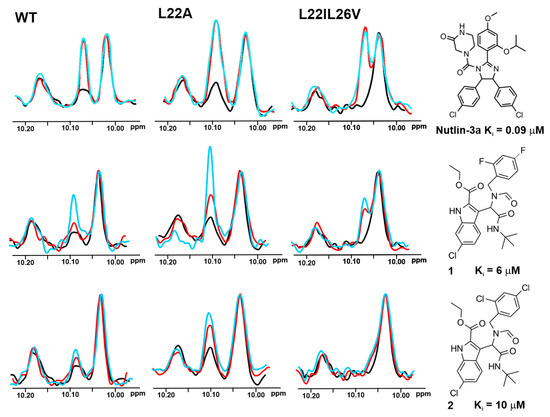 The 1D AIDA proton NMR spectra of the side chain NHε protons of tryptophans for the p53/Mdm2 complexes (p53-wt, L22A, and L22IL26V). All protein complexes (black) were treated with Nutlin-3a, compounds 1 and 2 in molar ratio: the protein to a compound 1:1 (red) and 1:2 (blue), respectively.