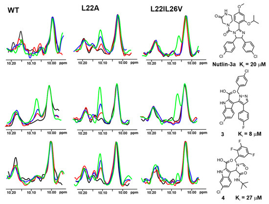 The 1D AIDA proton NMR spectra of the side chain NHε proton of tryptophans for the mutant-p53/MdmX complexes (p53-wt, L22A, and L22IL26V). All protein complexes (black) were treated with Nutlin-3a, compound 3 and 4 in molar ratio: the protein to a compound 1:1 (red), 1:2 (blue), and 1:5 (green), respectively.