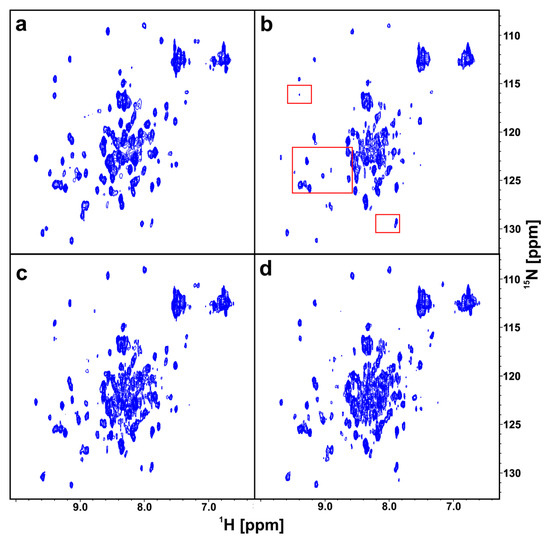 The 2D AIDA NMR for the mutant-PD-1/PD-L1 complexes. The spectra of apo-(N66A)PD-1 (a), the complex of (N66A)PD-1/PD-L1 with marked frames in red the most changing parts of the spectrum (b), the complex of (N66A)PD-1/PD-L1 with 5 (c), and 6 (d) in the molar ratio of the protein complex to the compound 1:1, respectively.