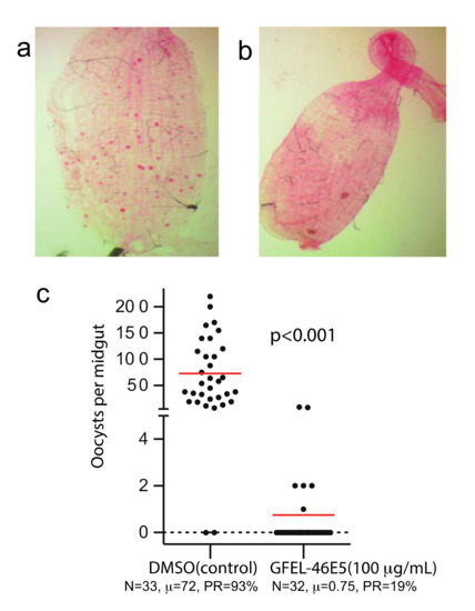 The candidate fungal extract (GFEL-46E5) significantly inhibited Plasmodium falciparum infection in mosquito midguts. (a) In the control group, a mosquito midgut was infected with P. falciparum. Each red dot represents one oocyst. (b) A mosquito midgut from GFEL-46E5 treated group did not possess P. falciparum oocysts. (c) Mosquitoes fed with P. falciparum containing GFEL-46E5 extract or dimethyl sulfoxide (DMSO, control) showed different numbers of oocysts. Each spot represents the number of oocysts in a mosquito midgut. The difference between the two groups was significant (p < 0.001). N: # of mosquitoes for each treatment; μ: the mean oocysts per midgut; PR: infection prevalence in mosquitoes. The assays were repeated independently three times.