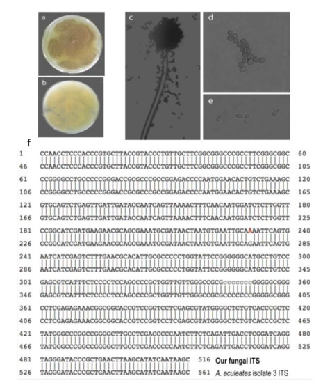 The candidate fungus GFEL-46E5 is an Aspergillus aculeatus isolate according to morphology and ITS (internal transcribed spacer) sequence. (a) Top view of the fungus colony on MEA; (b) Bottom view of the fungus on MEA; (c) conidial head; (d) subspherical conidia; (e) ellipsoidal conidia; and (f) ITS sequence aligns with the ITS of Aspergillus aculeatus isolate three from NCBI (Access #: NR_111412).