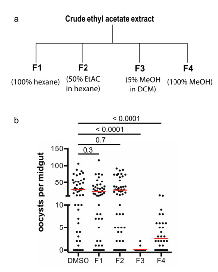 Fractions and activity analysis. (a) The crude extract was fractioned by a gravity silica column. (b) The activities of four fractions in inhibiting malaria transmission were determined by SMFA (standard membrane feeding assays).