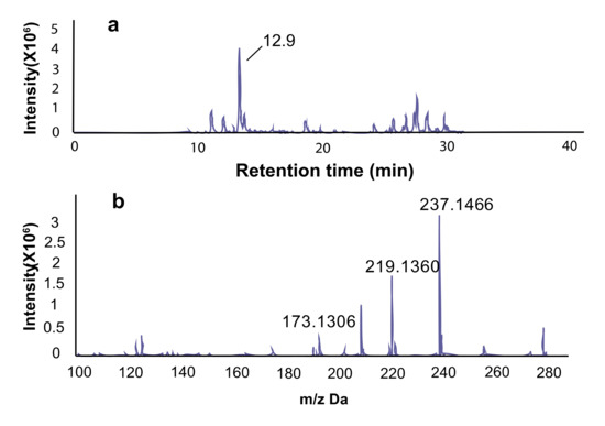 Isolation and purification of active compounds. (a) The active fraction 3 was subjected to LC-MS. The significant component is at 12.9 m in the LC; (b) the exact m/z from the significant component was 237.1466 ([M+H]+, C14H21O3; calculated 237.1485), 219.1360 [M+H-H2O]+, 173.1306 [M+H-2×H2O-CO]+.